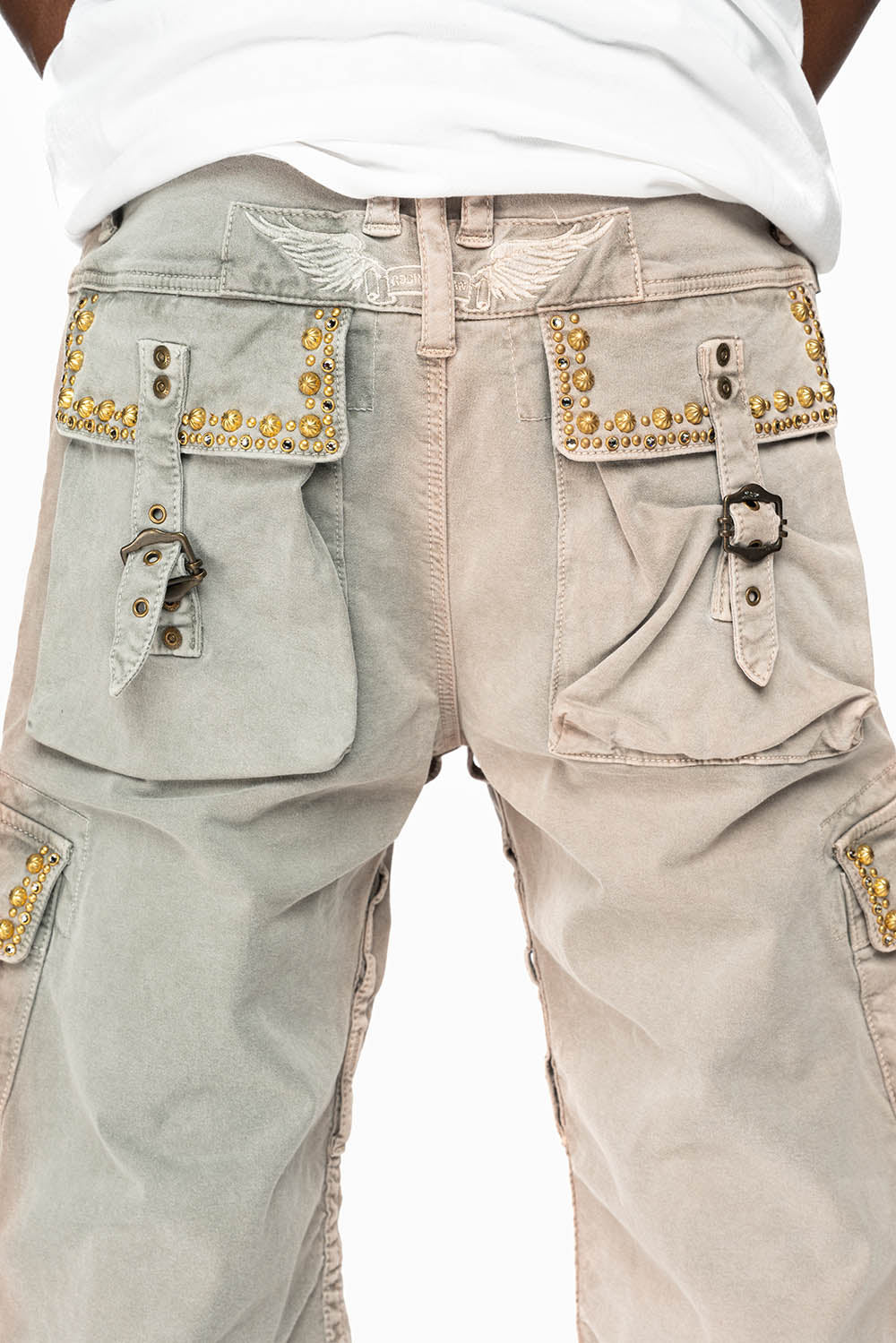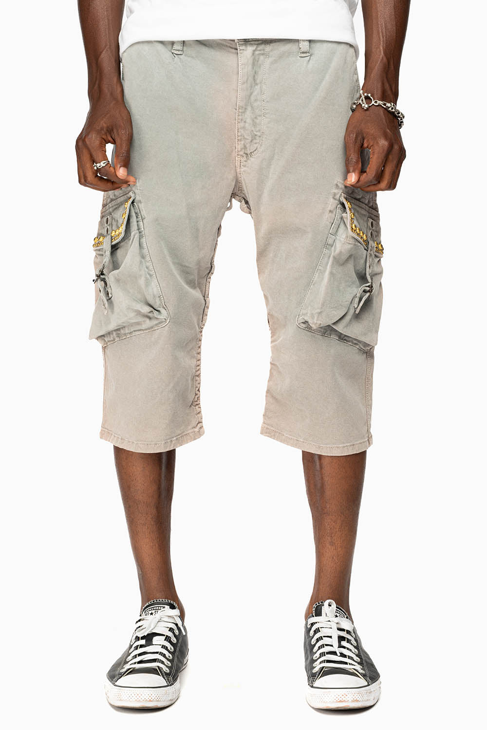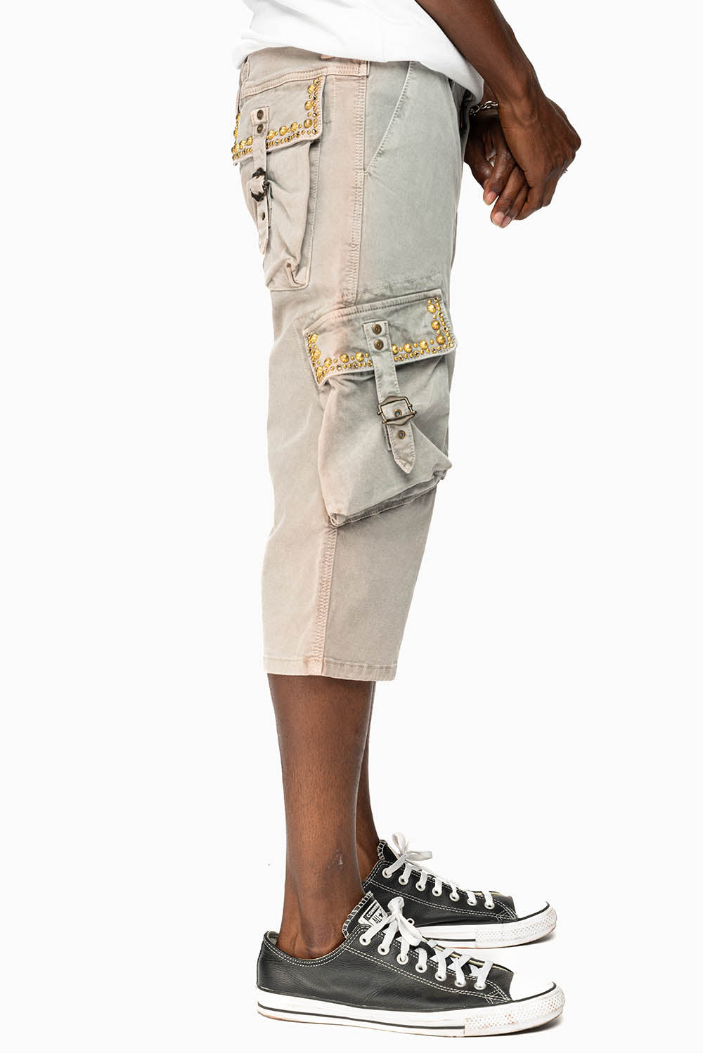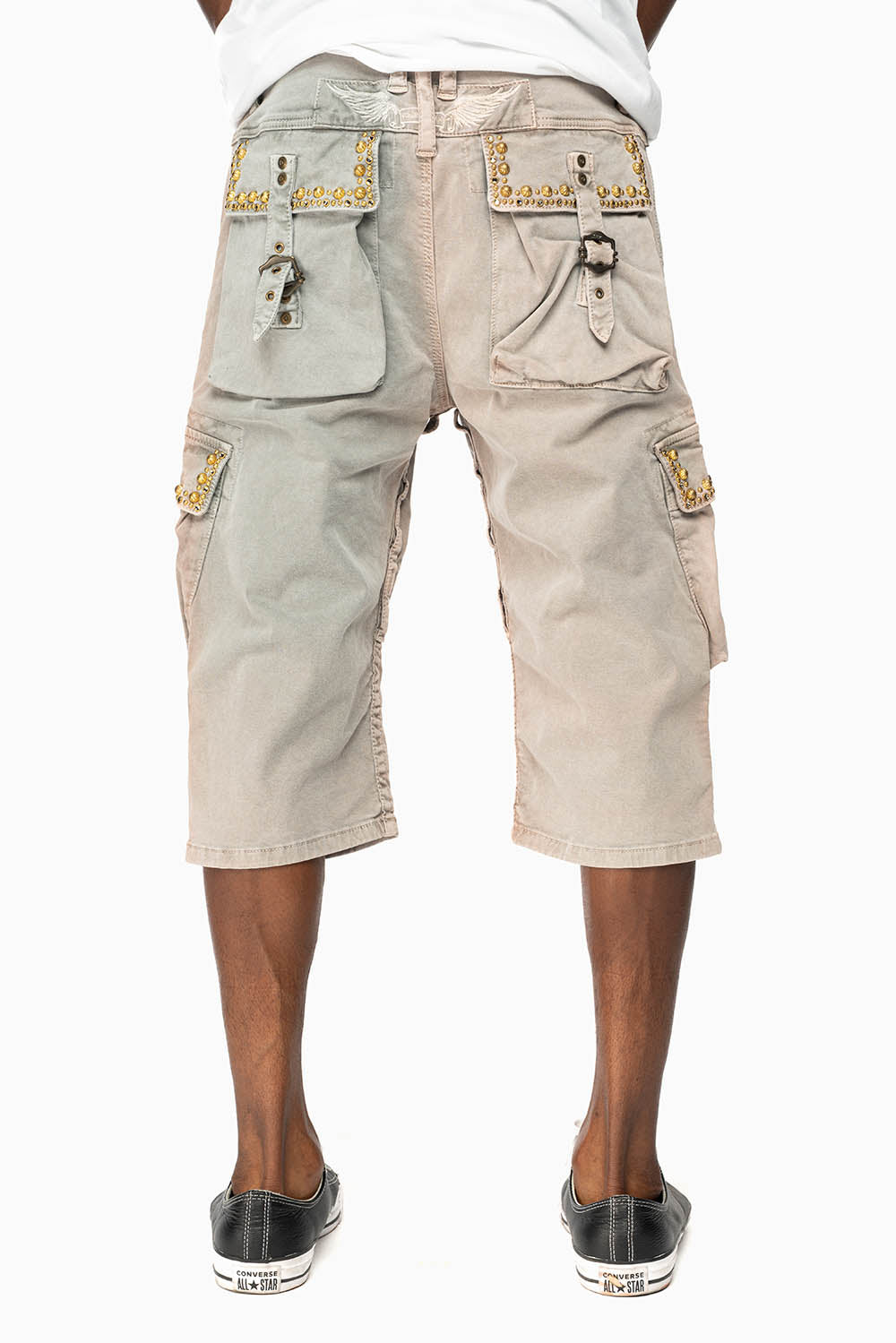 MEN'S MILITARY CARGO SHORTS WITH STUDS AND CRYSTALS IN CEMENT WASH