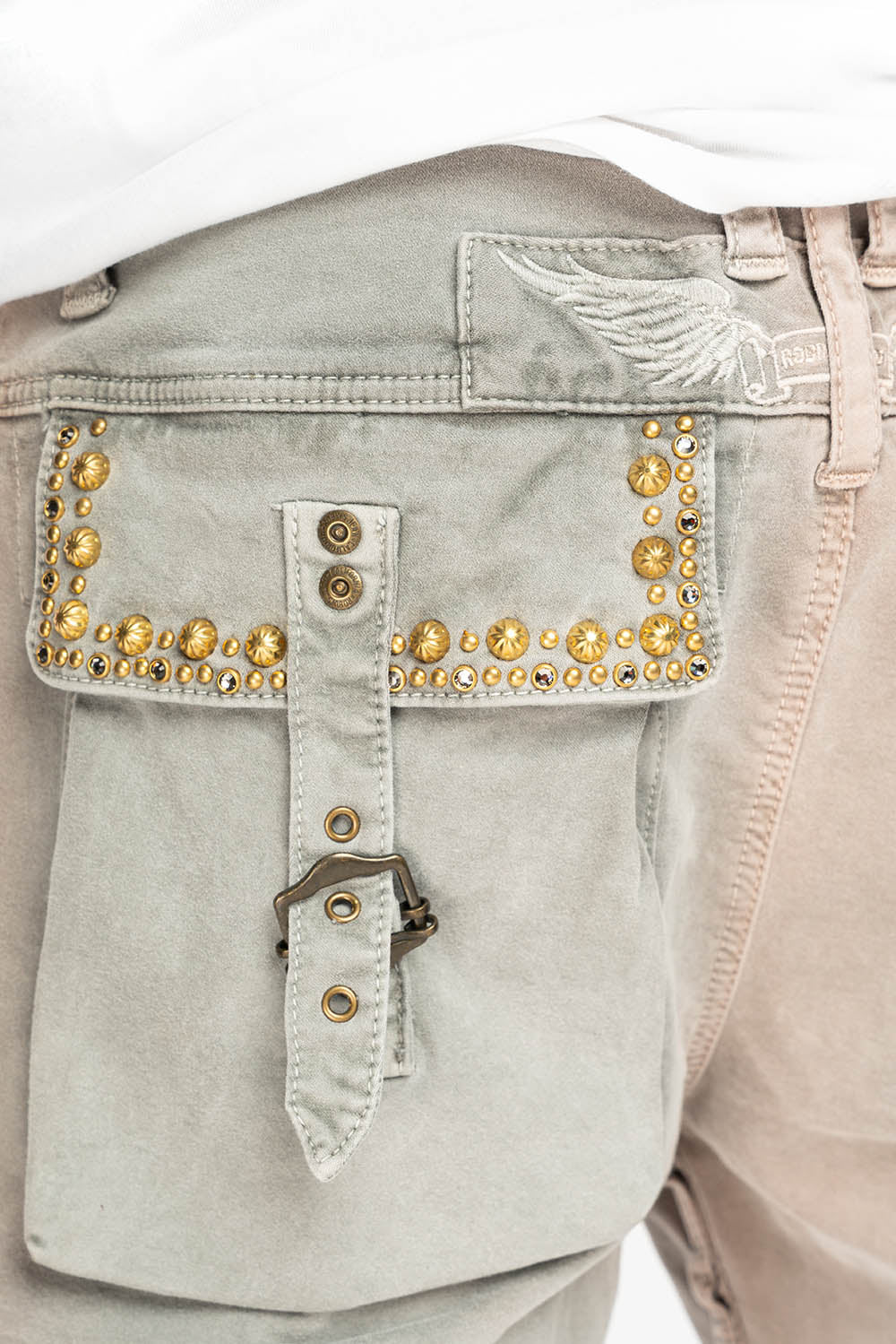 Robin's Limited Edition Military cargo Shorts in Cement wash. These shorts come with cargo pockets (front and rear) embellished with Black Diamond Crystals and studs .These shorts come in a soft light stretch poplin fabric for maximum comfort.