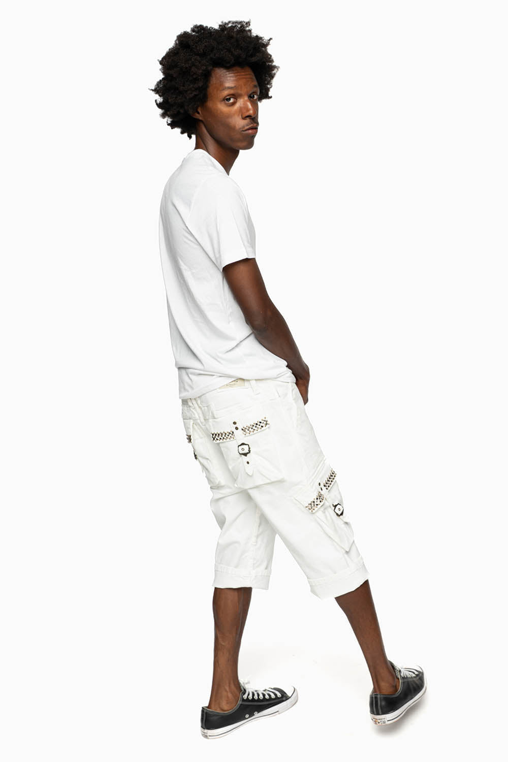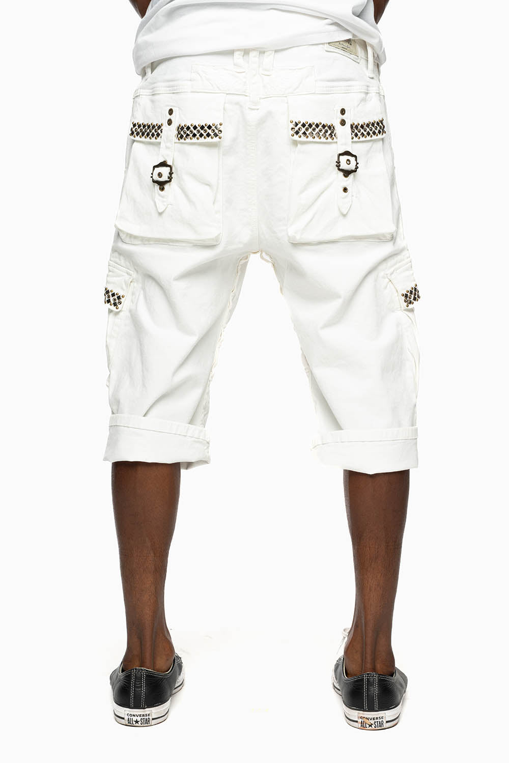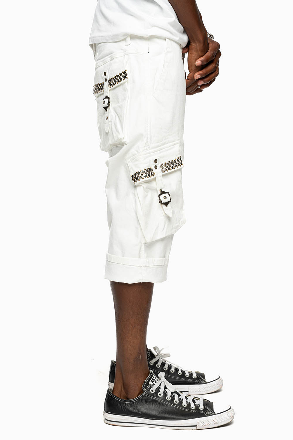 MENS MILITARY CARGO SHORTS IN WHITE WITH STUDS AND CRYSTALS