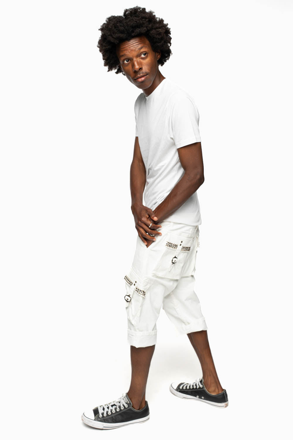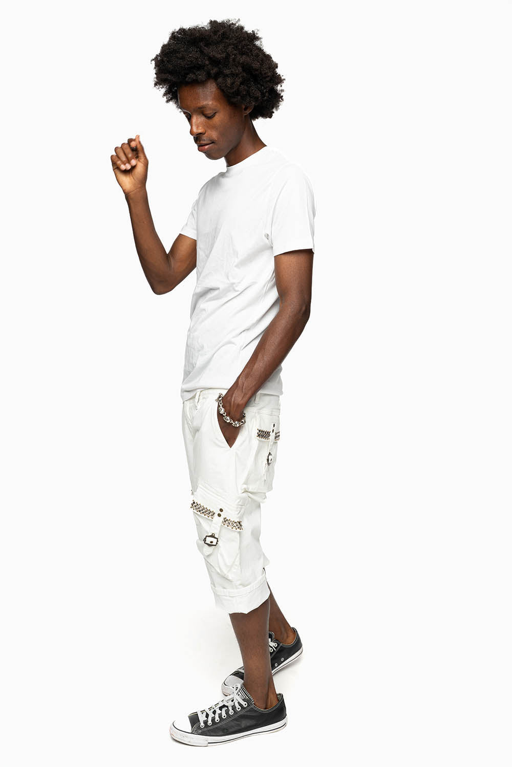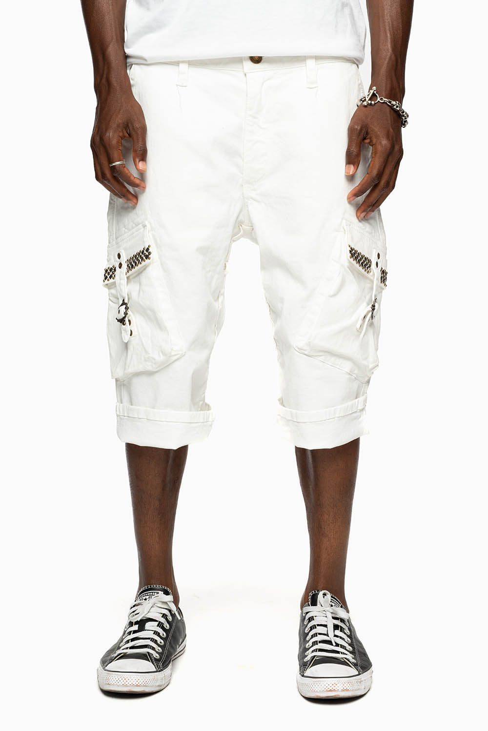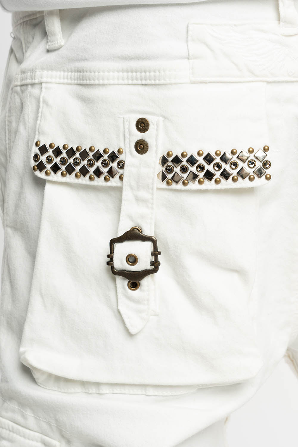 MENS MILITARY CARGO SHORTS IN WHITE WITH STUDS AND CRYSTALS