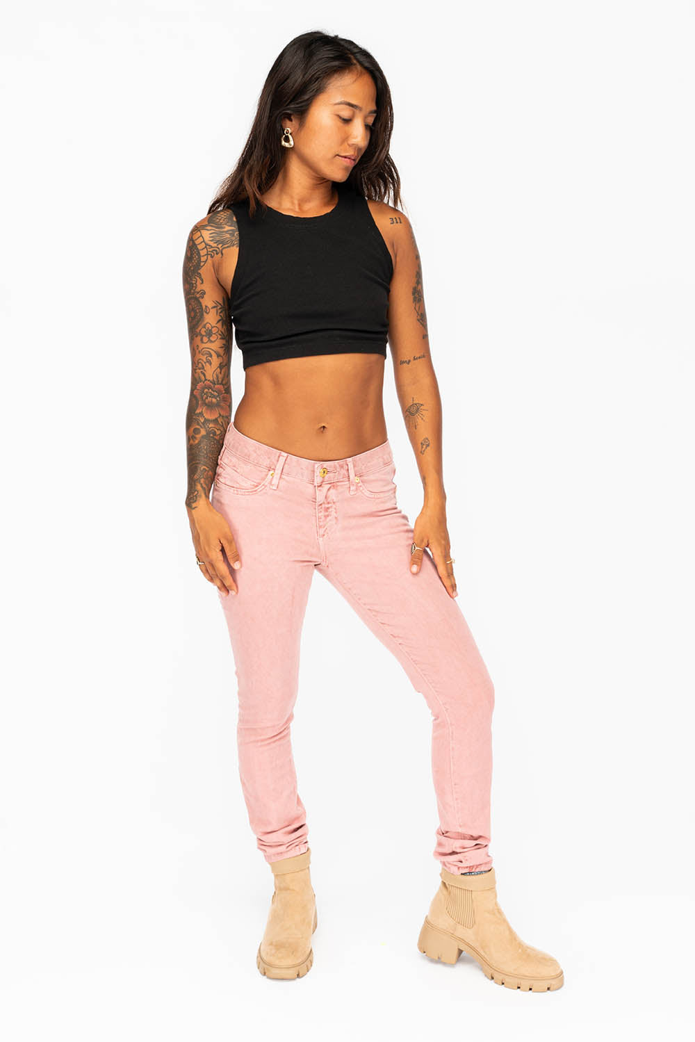 MID RISE WOMENS SKINNY JEANS IN LIGHT PINK WASH