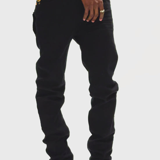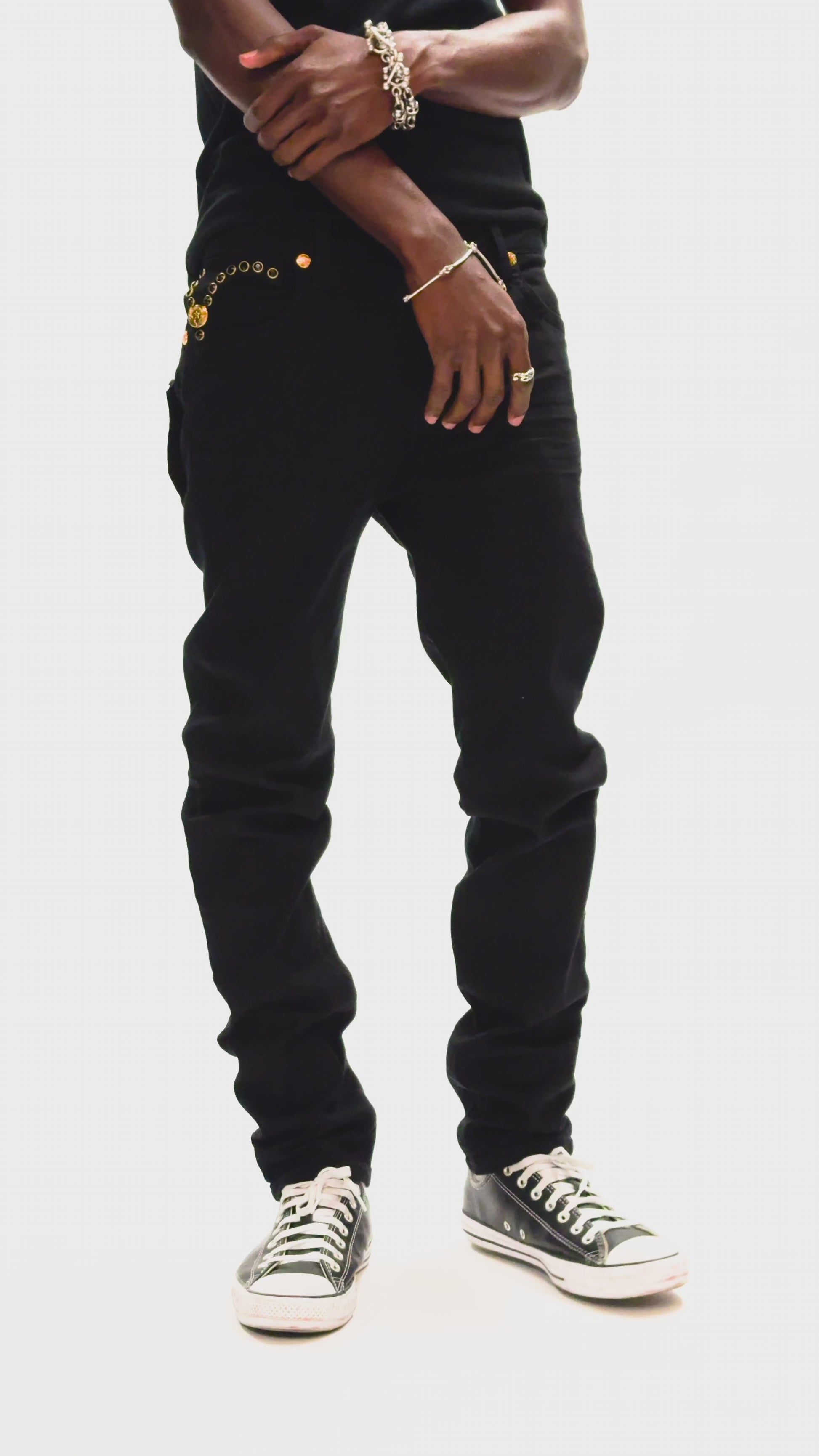 Robin's Killer Flap jeans with zippers in Pure Blk Wash with gold embroidered OE and embellished pockets with X-Large Jet Blk Crystals. These jeans are specialty washed, they are fitted, skinny fit, and constructed using premium stretch denim for both comfort and style.
